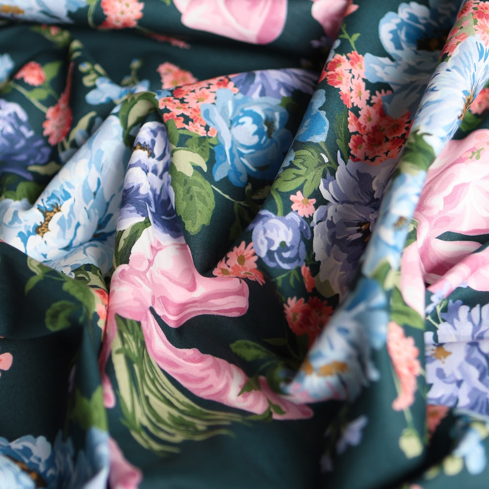 Assembled from an array of botanical prints unearthed in the Liberty archive, Bow Bouquet celebrates the kaleidoscope of colours and the splendour of nature’s beauty, boasting a symphony of opulent blooms. Echoing the grandeur of the Regency era, this theatrical pattern features roses, peonies, asters, lilacs, and larkspur, forming breath-taking bouquets delicately bound together with silk satin bows. Set against richly hued backdrops, these flowers take centre stage, their jewel hues accentuated and intensified, to add depth and visual contrast.