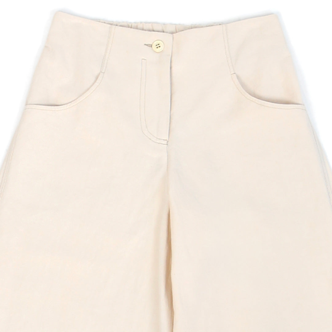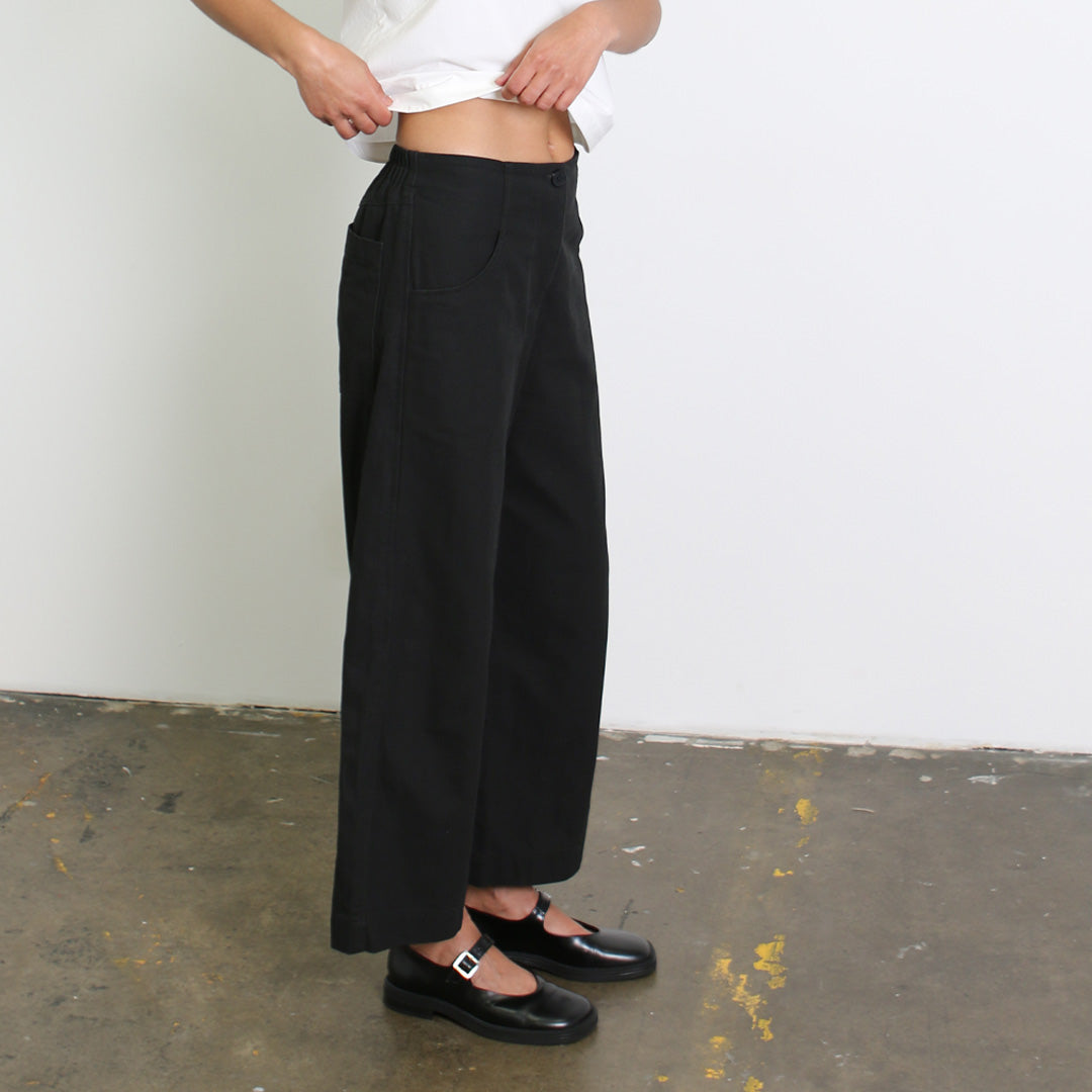 The Alba Pants are a stylish design featuring wide, cropped legs with a subtly curved silhouette. The comfortable mid-rise waist has a unique faced, flat front with an elasticated back. The single button, fly front closure and back yokes give a neat, fitted hip and minimal waist gathers. Curved inset front pockets, single rear patch pocket, back yoke, side seams and hems are all topstitched and look great when highlighted in contrast thread.