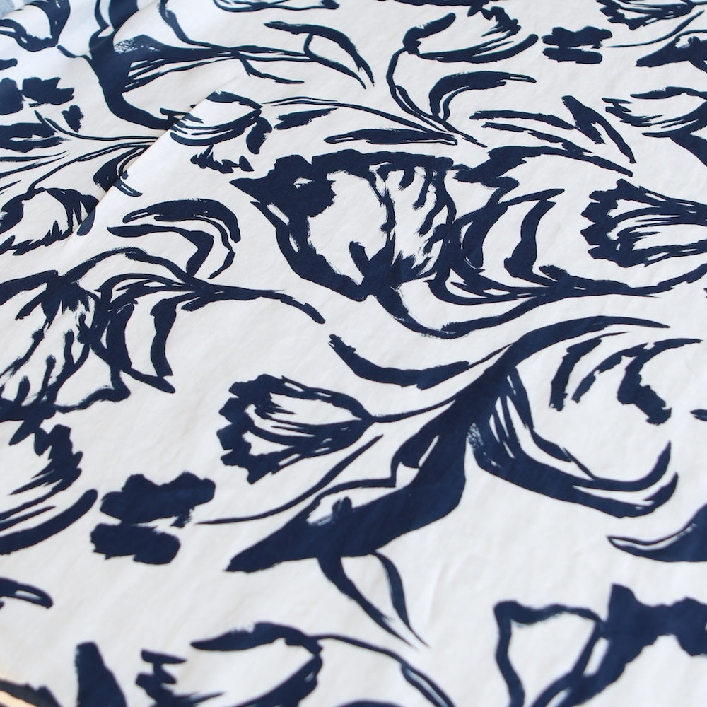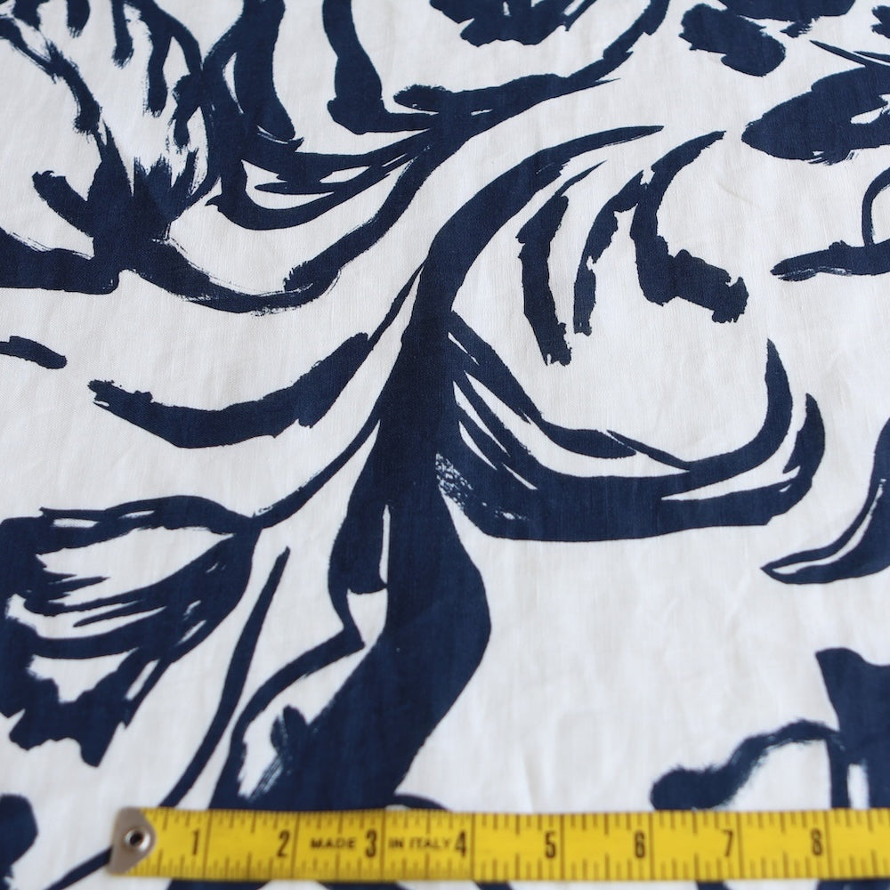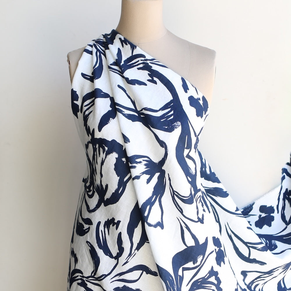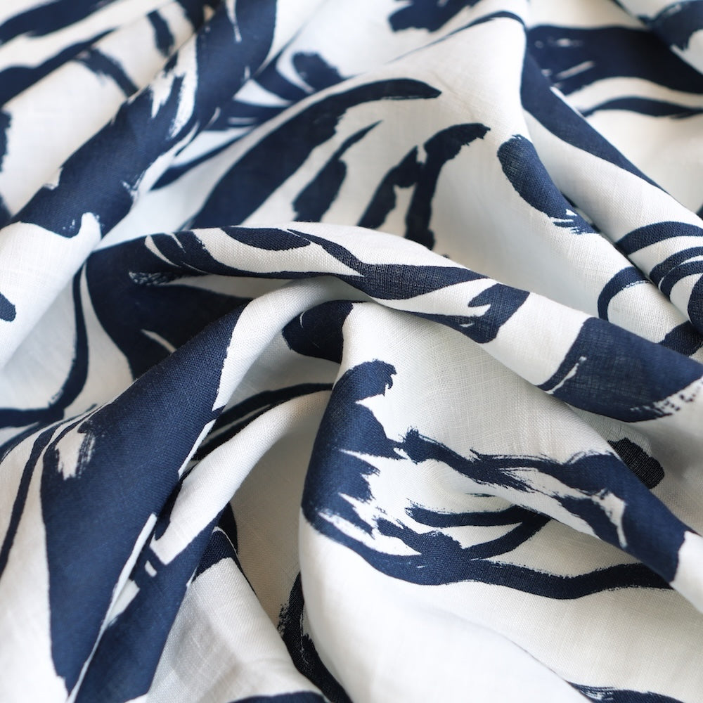 White/navy floral strokes printed medium weight 100% linen