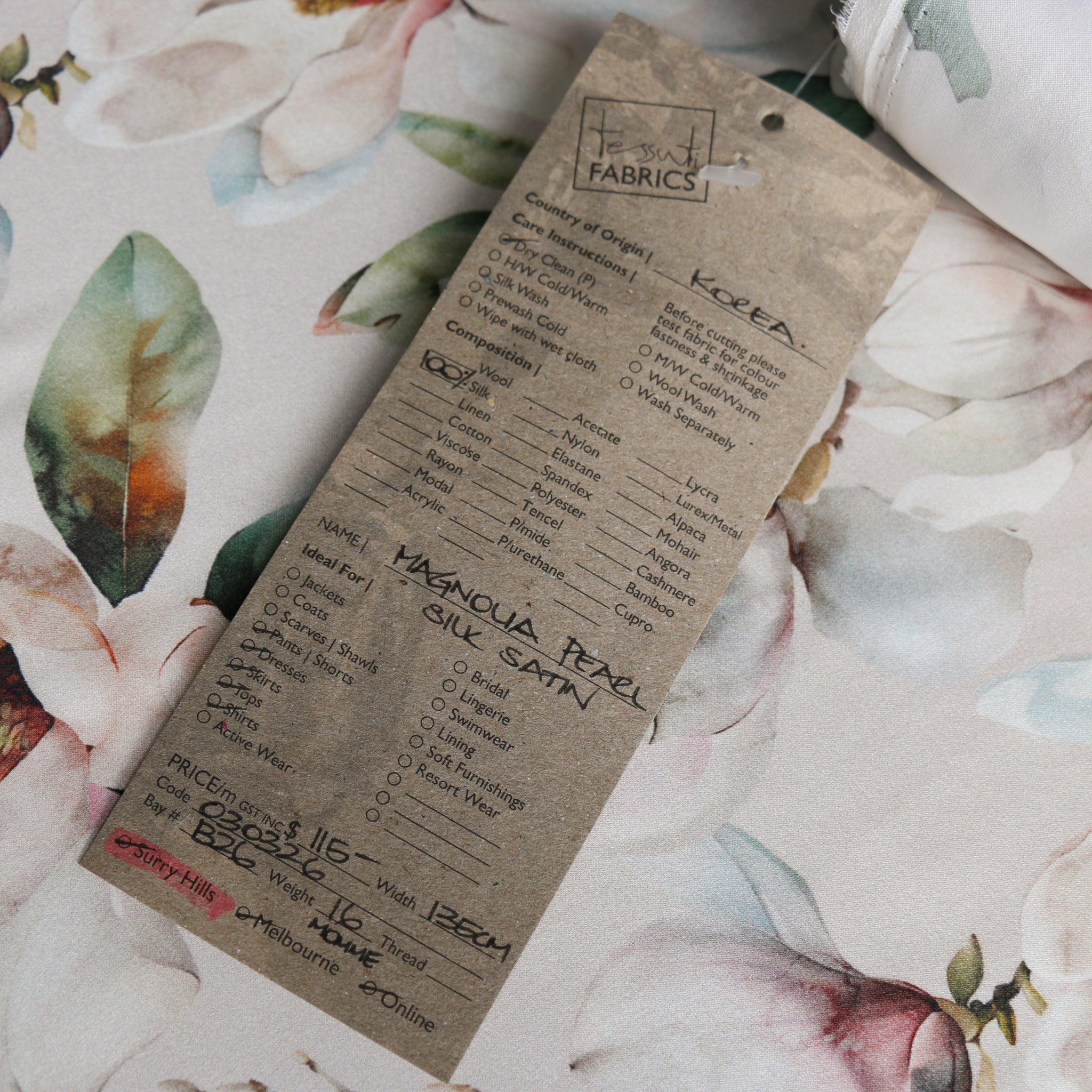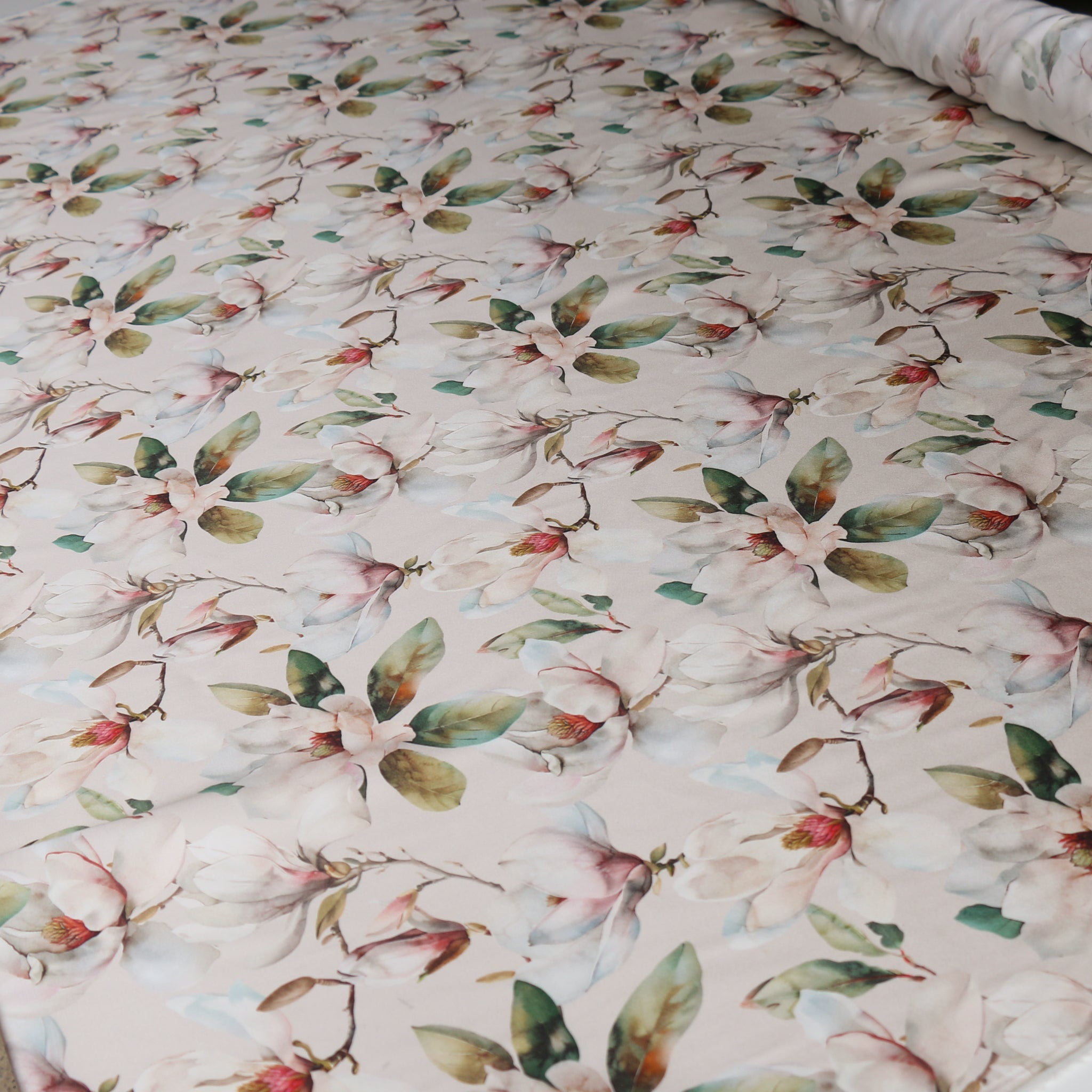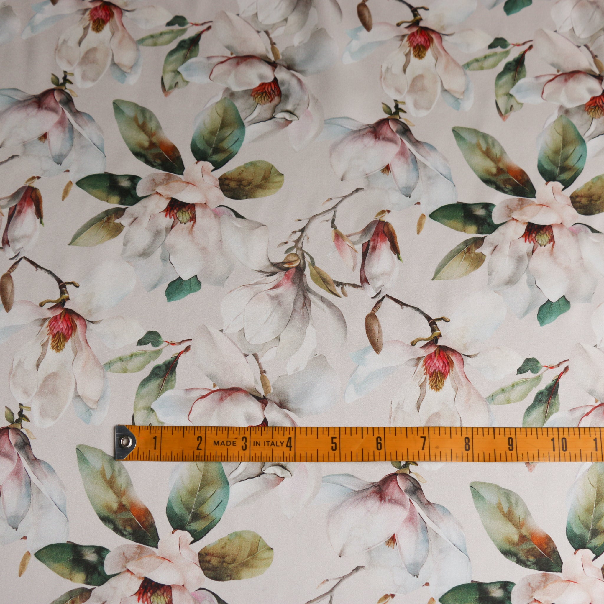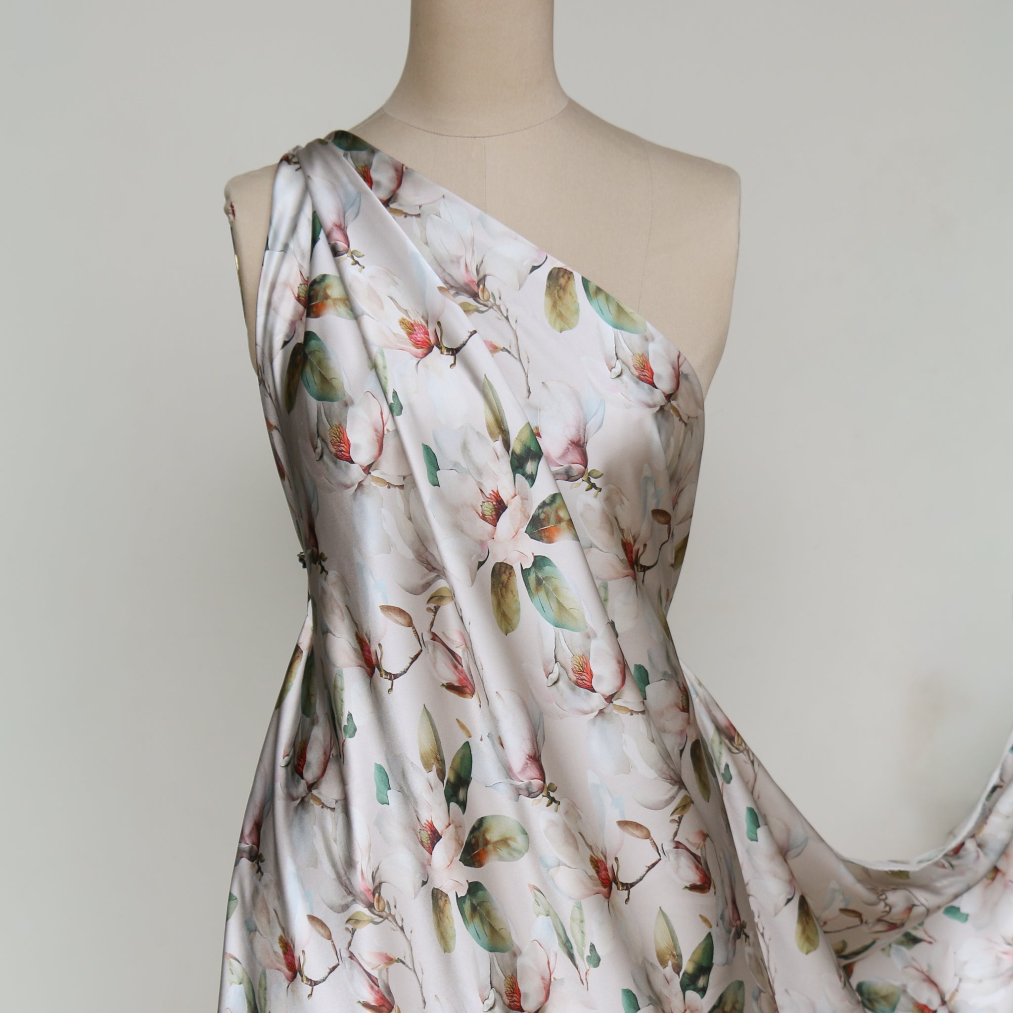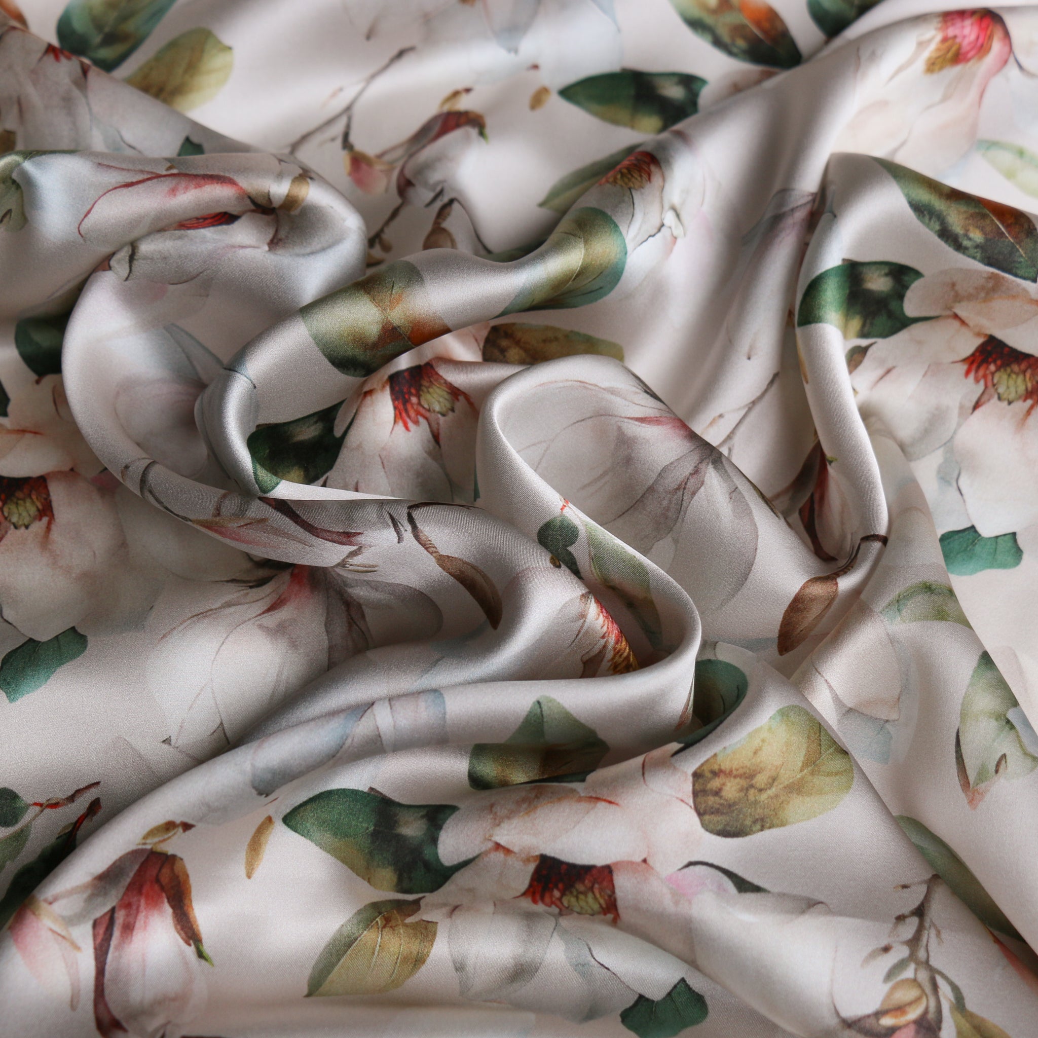 Magnolia floral on pearl digitally printed 100% silk satin