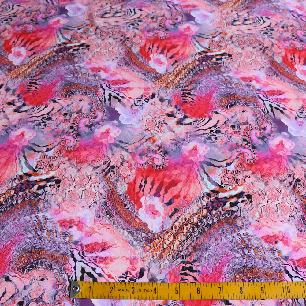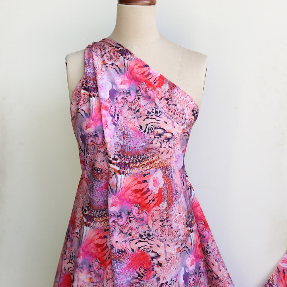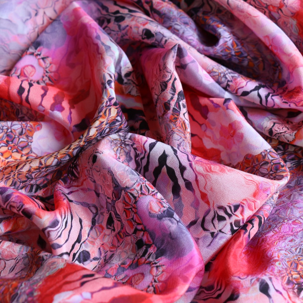 Designer end pink/purple/red kaleidoscope effect printed 100% silk crepe de chine