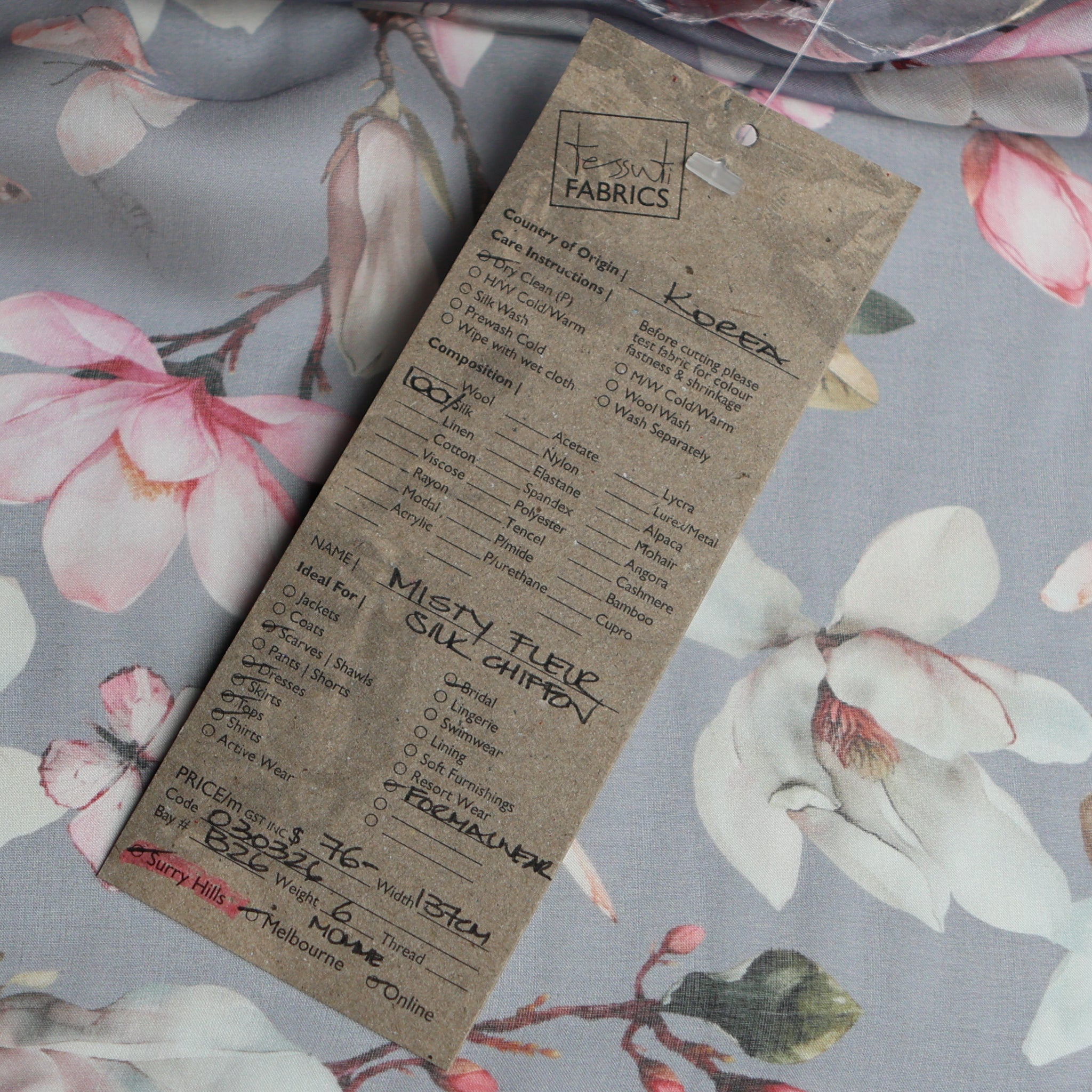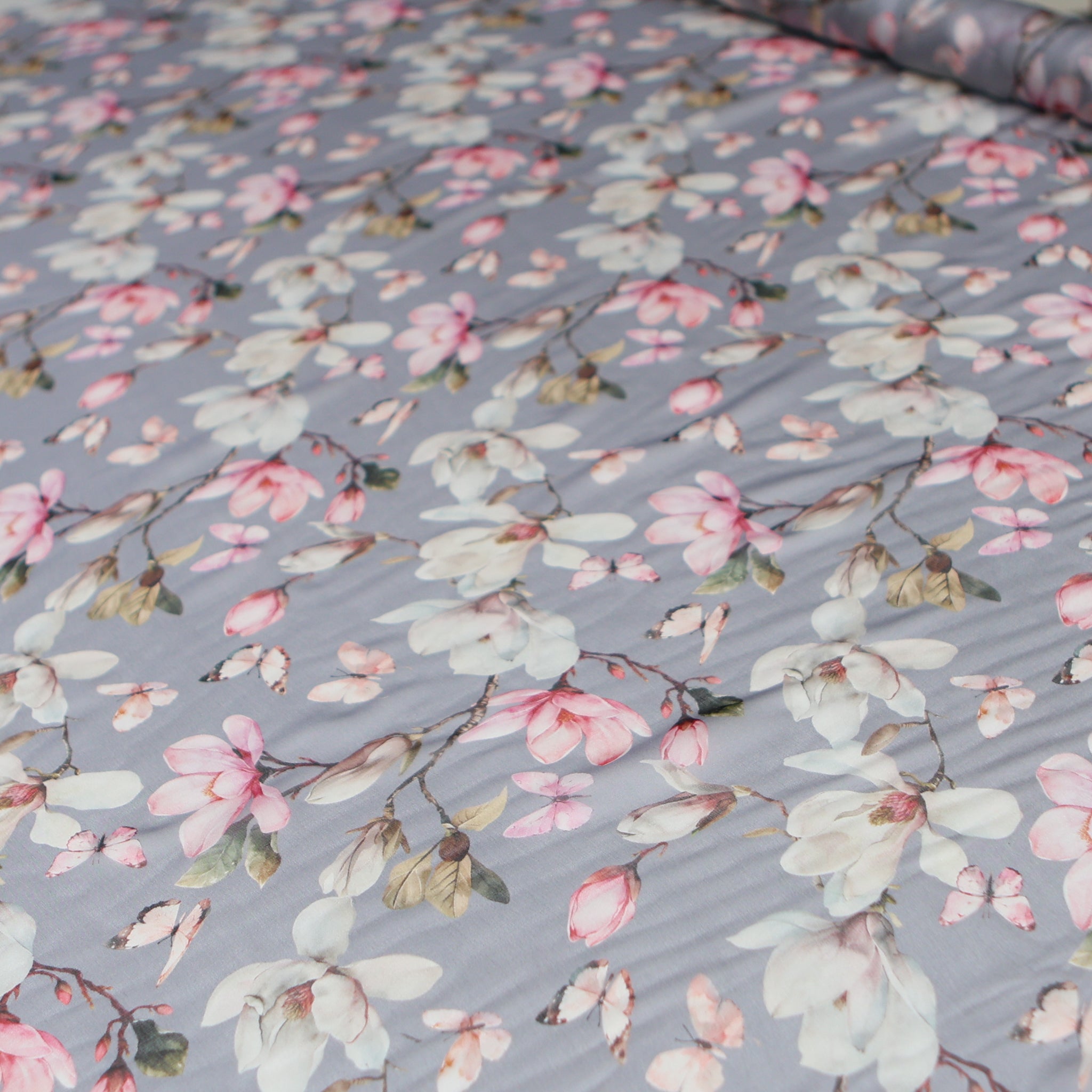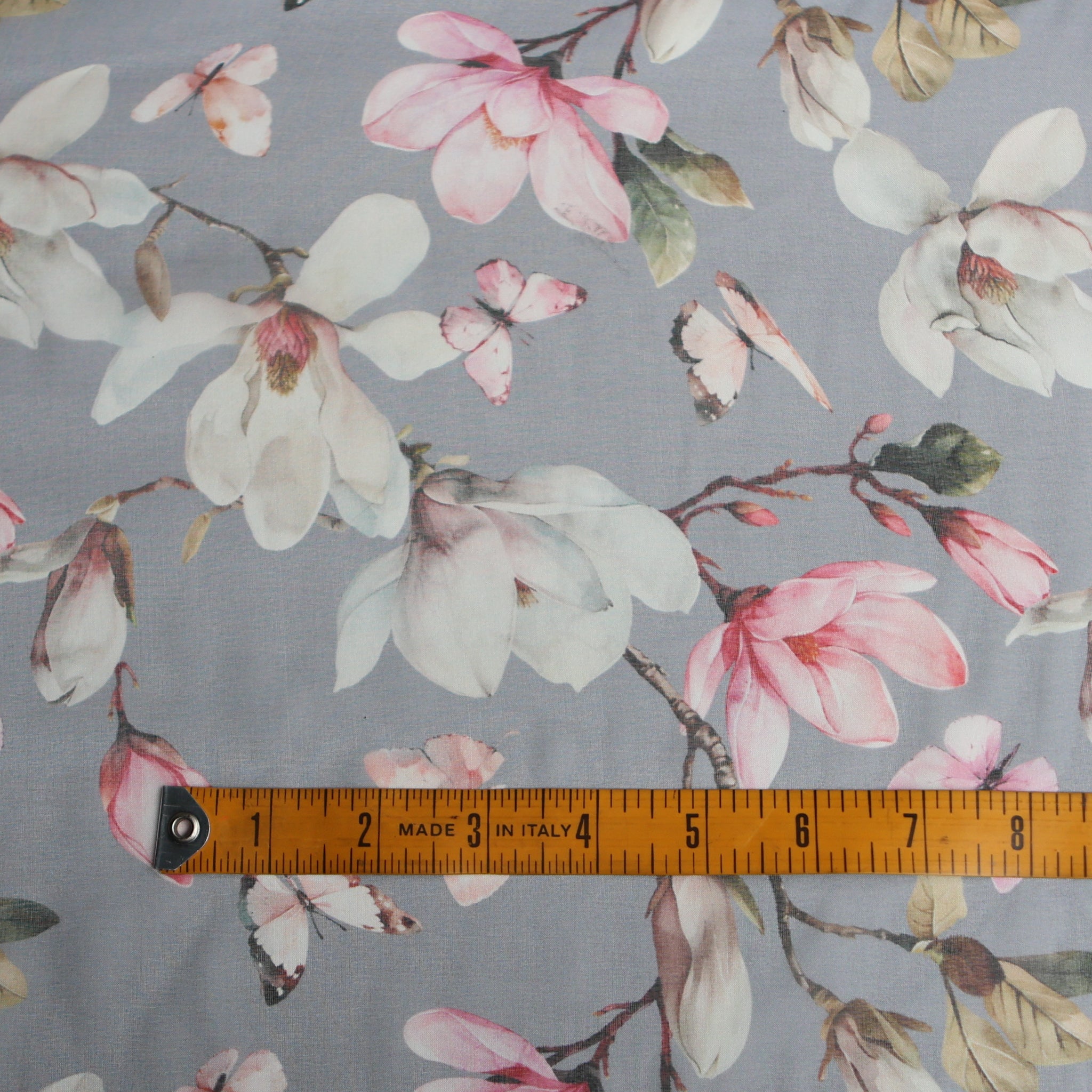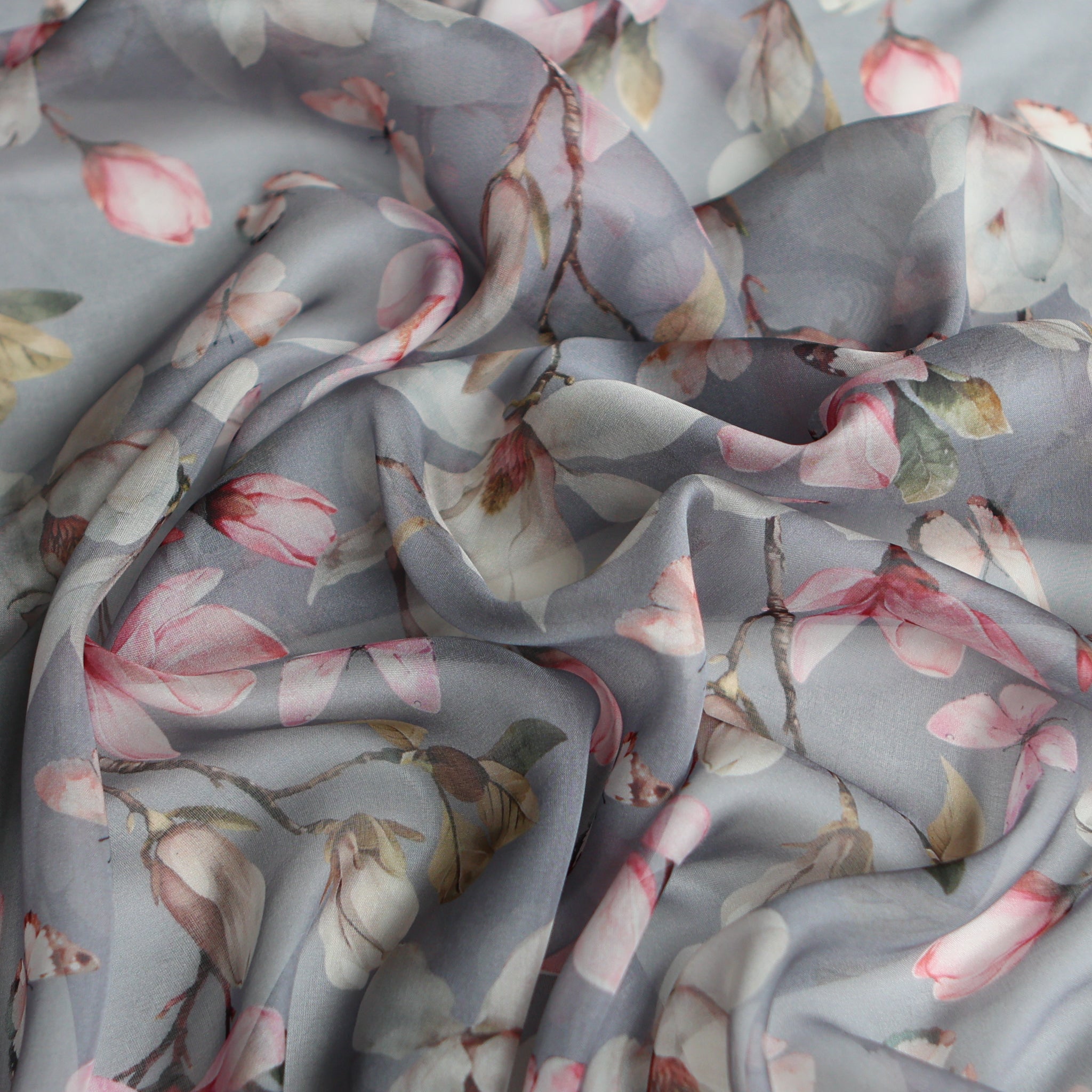 Magnolia floral/platinum digitally printed 100% silk chiffon
