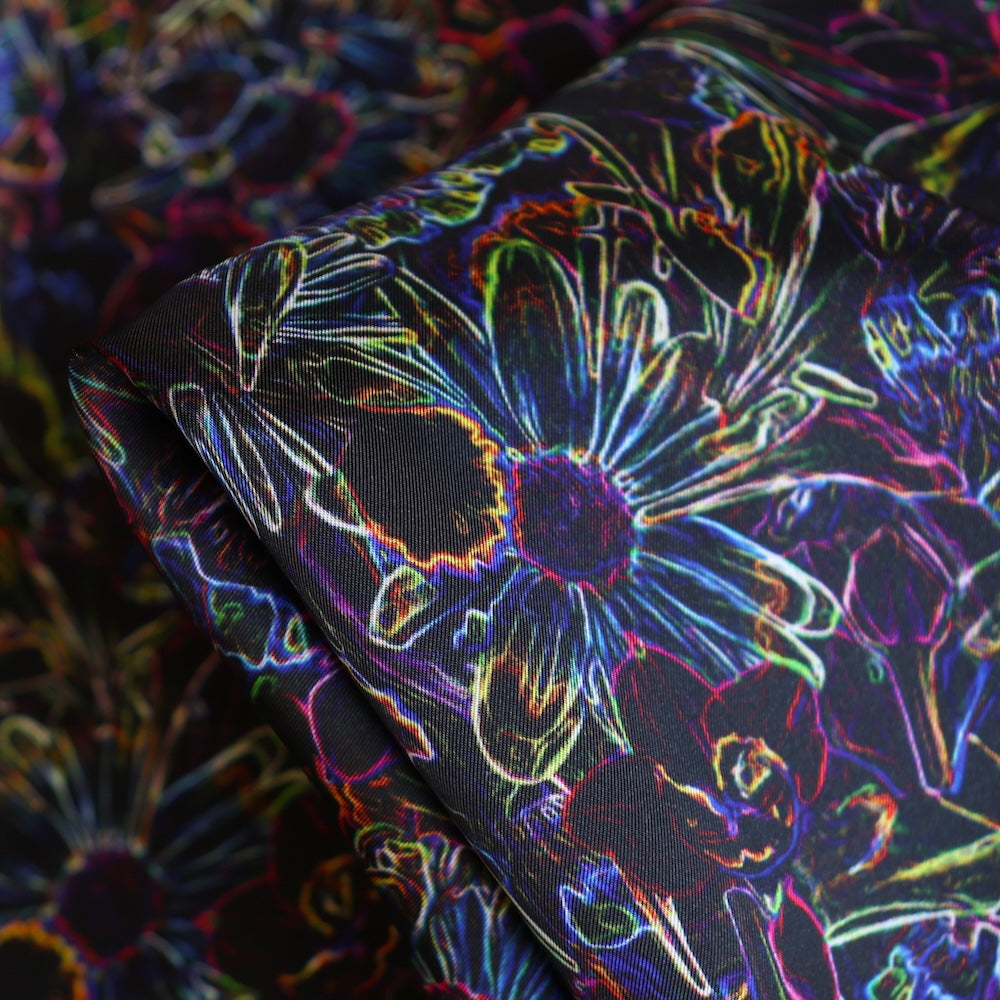 Scanned flowers and petals have been manipulated digitally to create this neon light effect as a new take on a modern textural photographic floral design.
