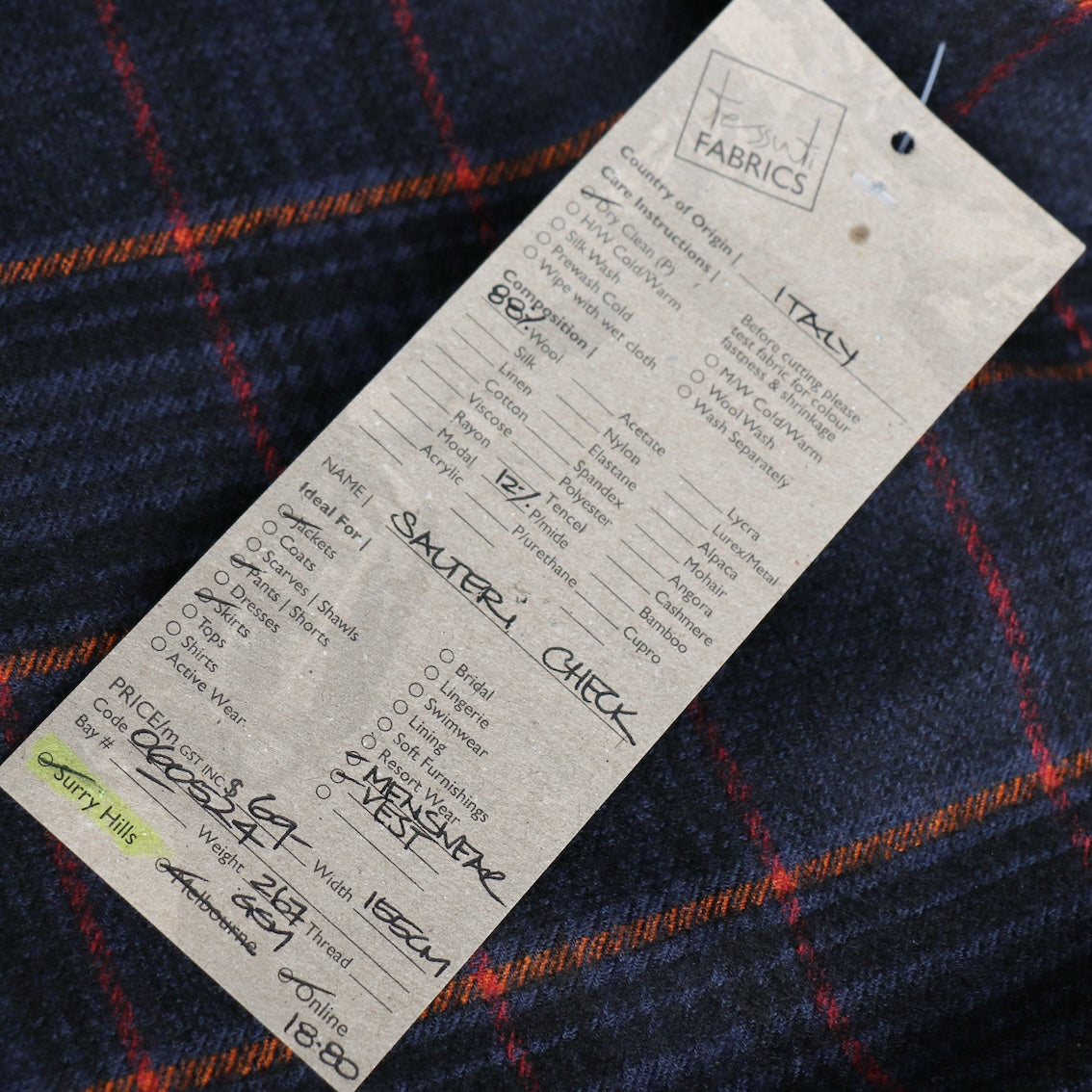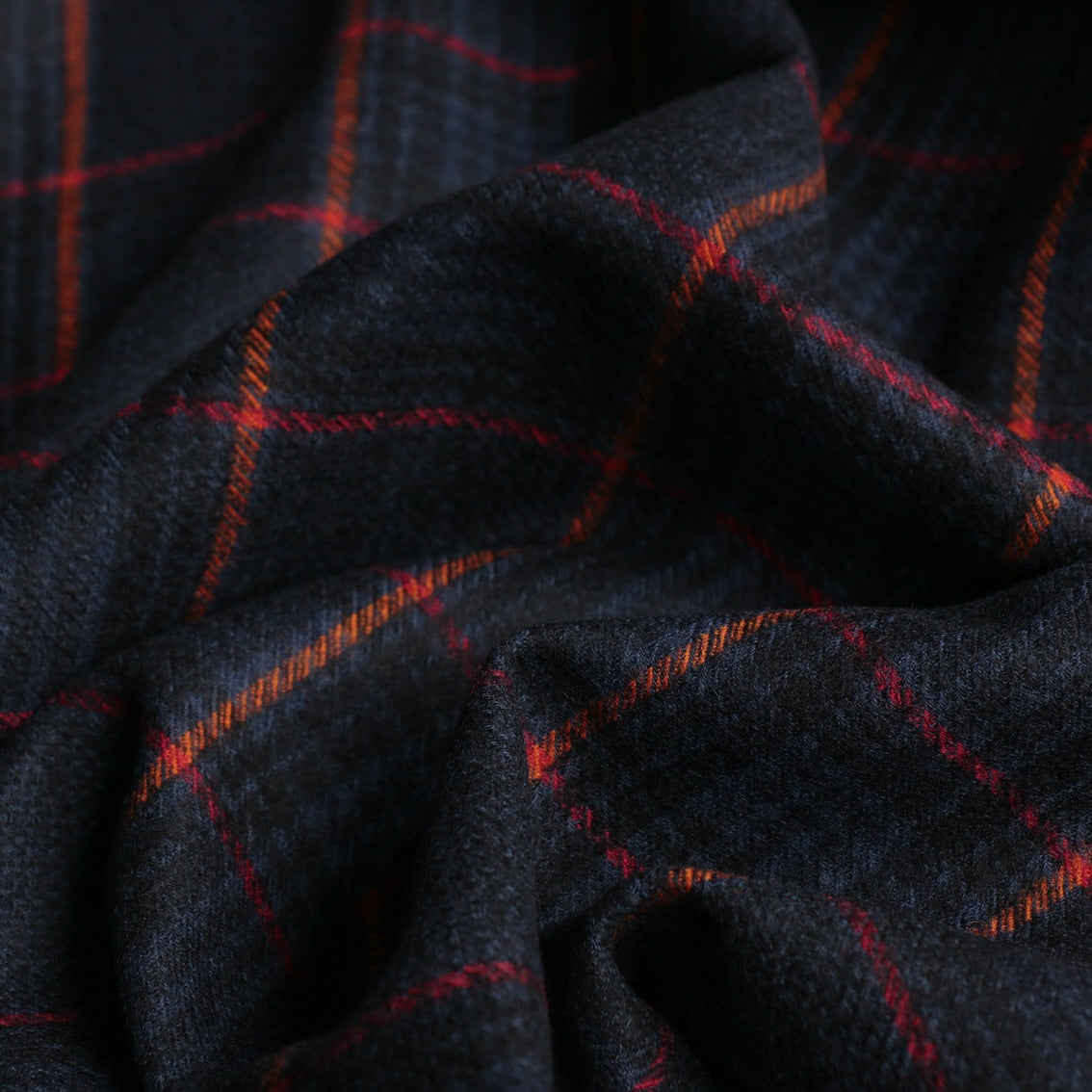 Italian blue/black/orange/red checked 88% wool 12% polyamide