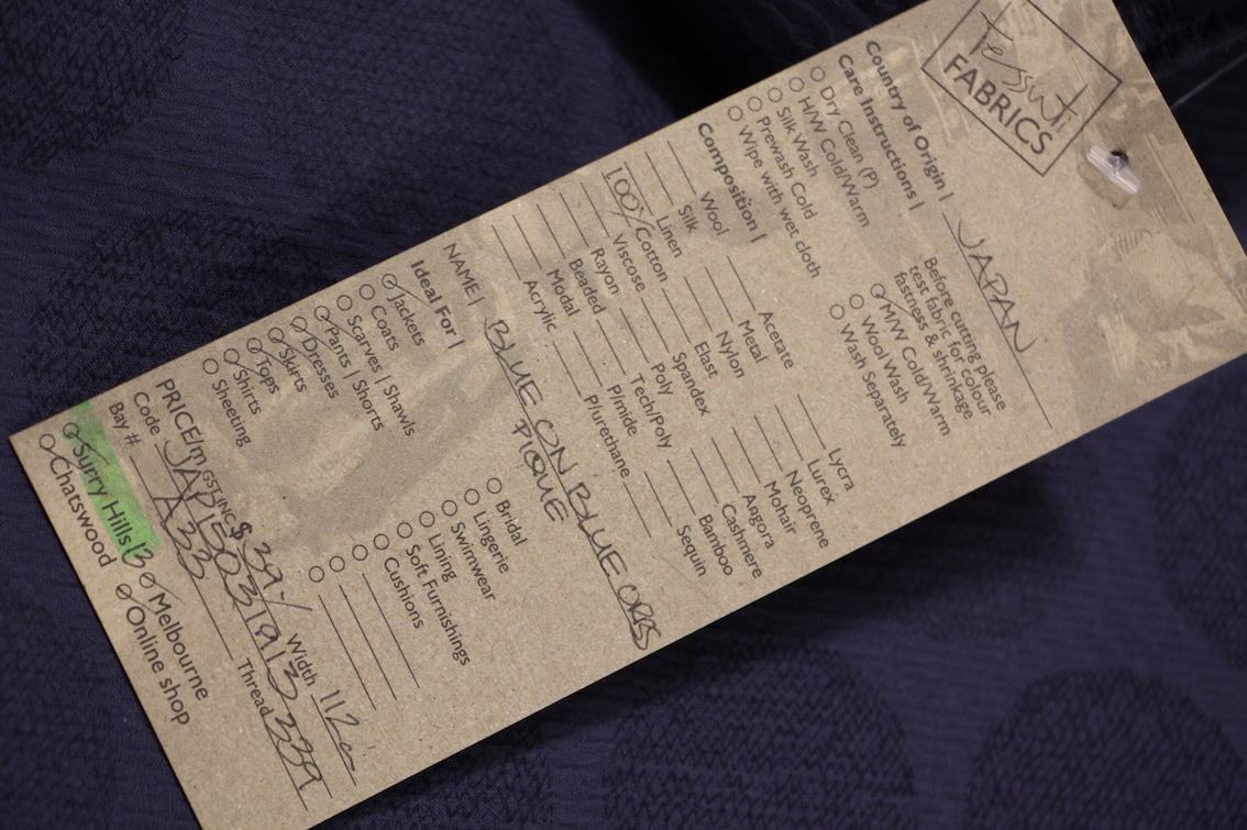 Japanese blue on blue printed 100% cotton pique. Width:115cm
