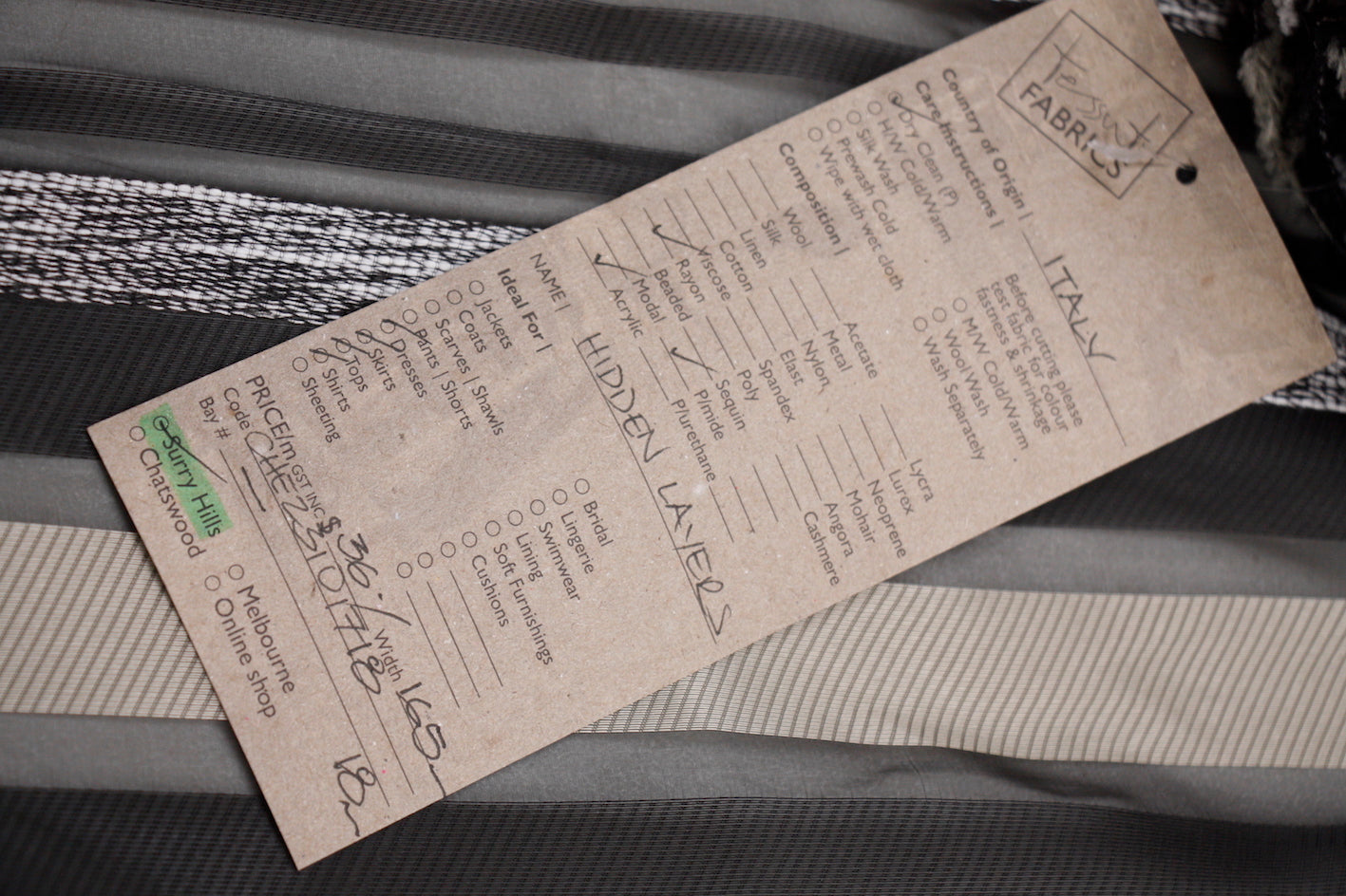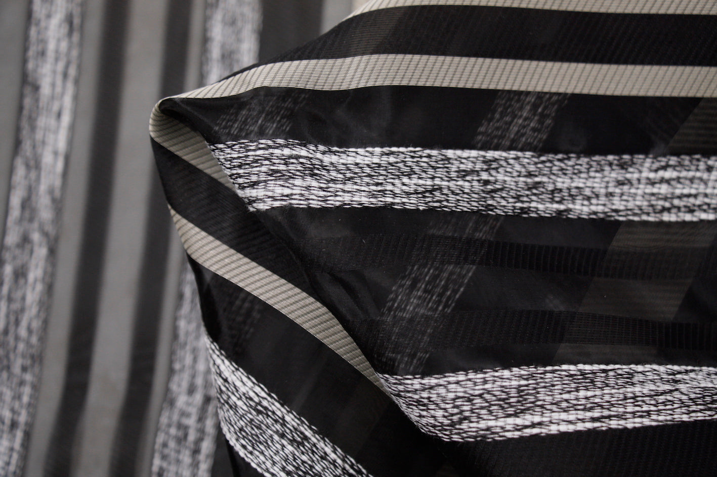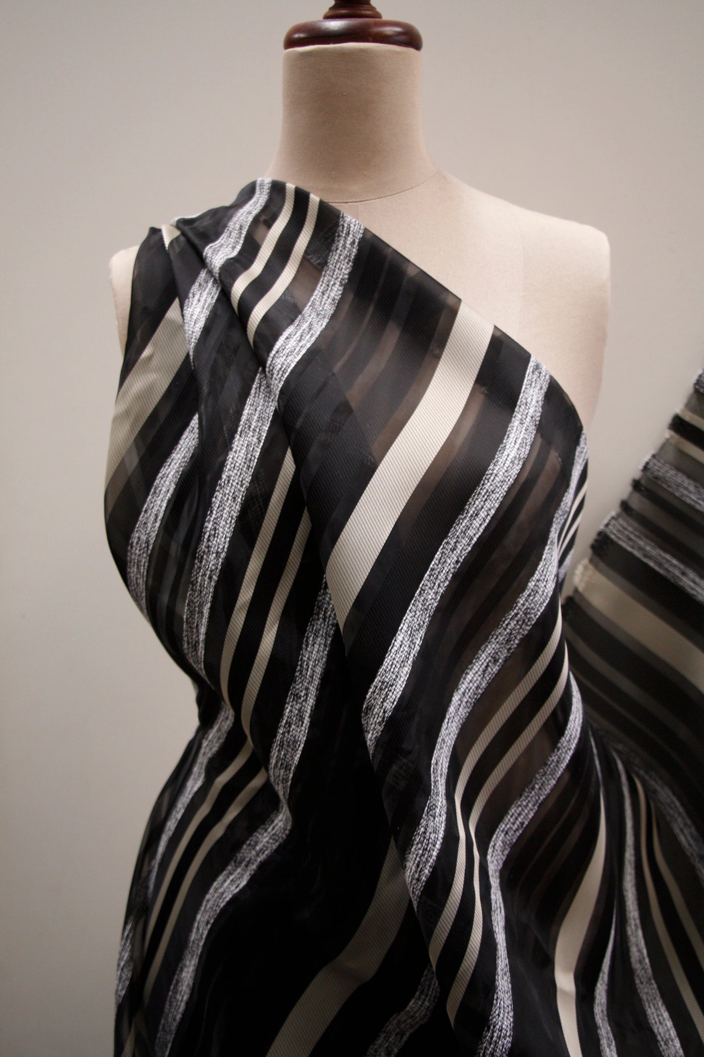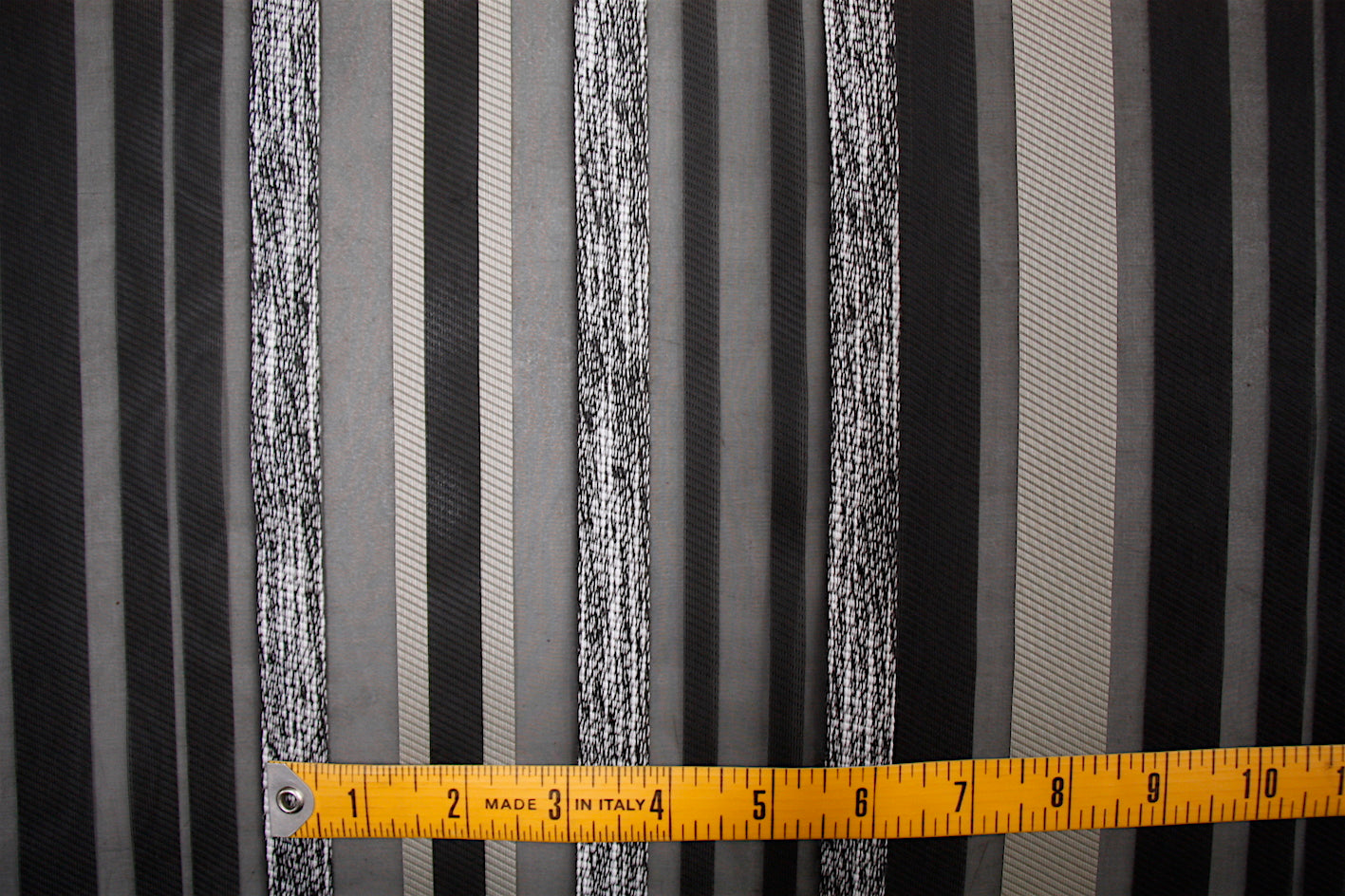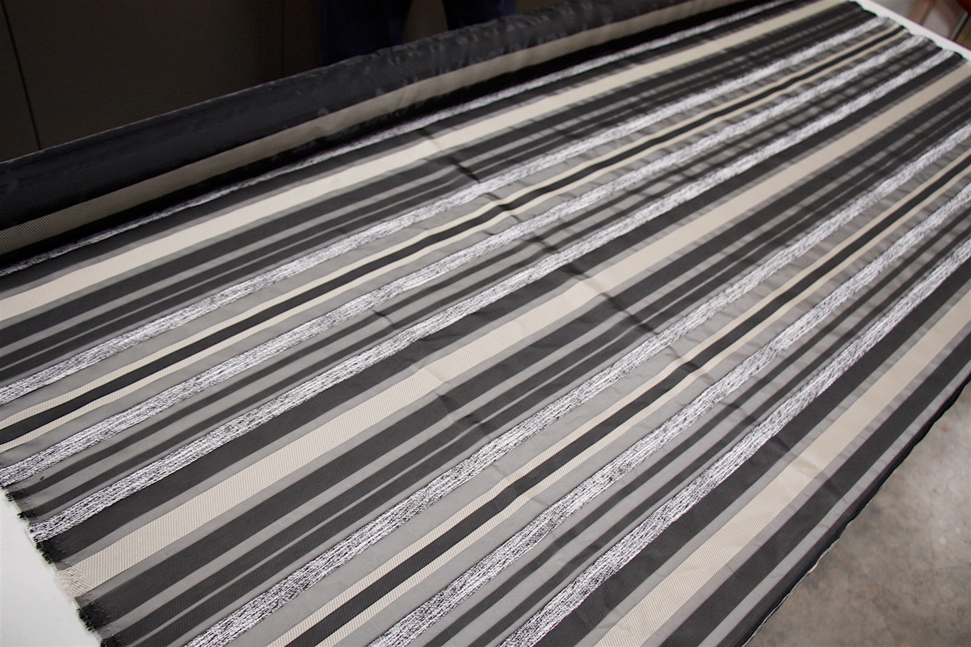 Italian designer striped rayon/acrylic/polyamide on sheer black organza. Width:165cm