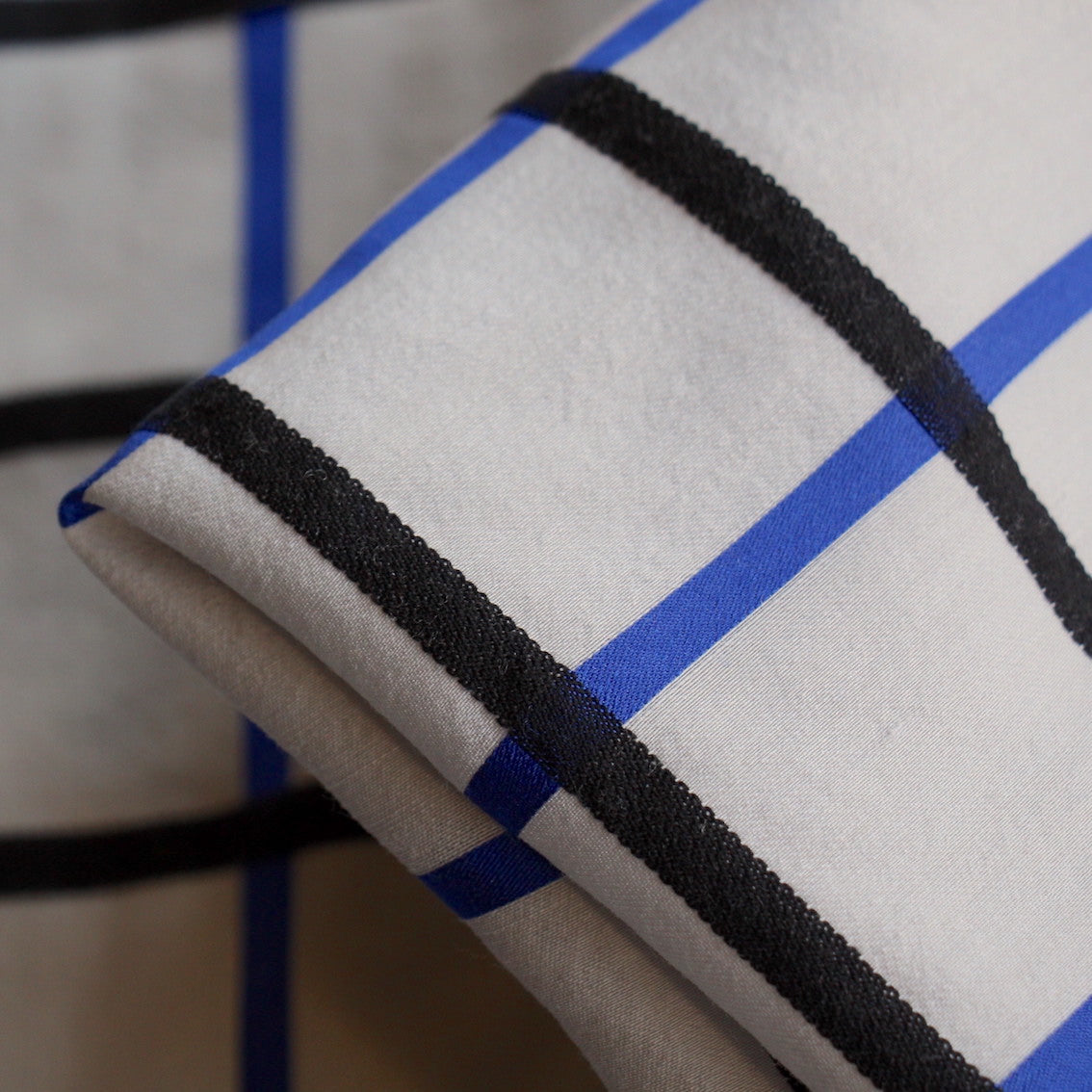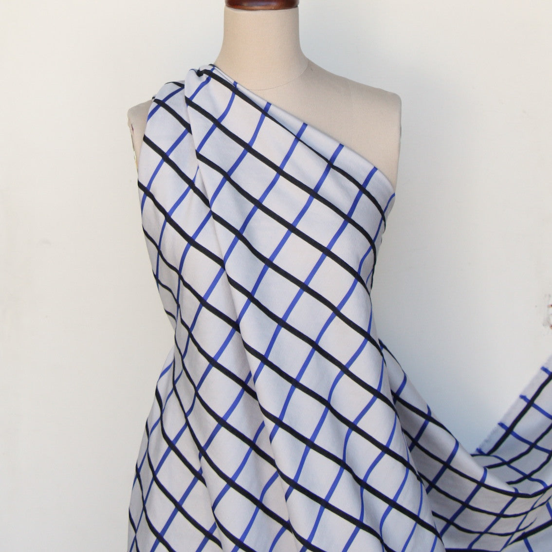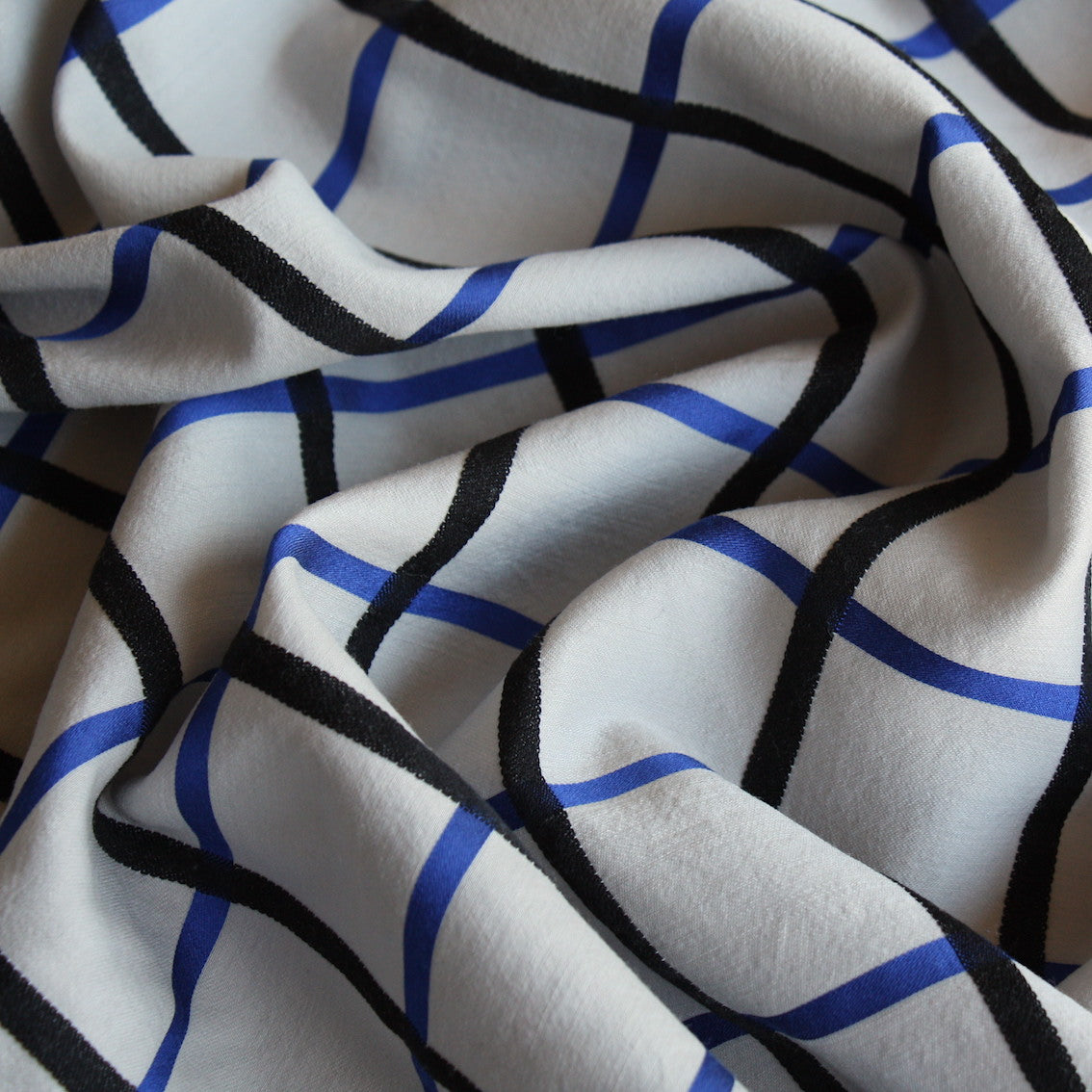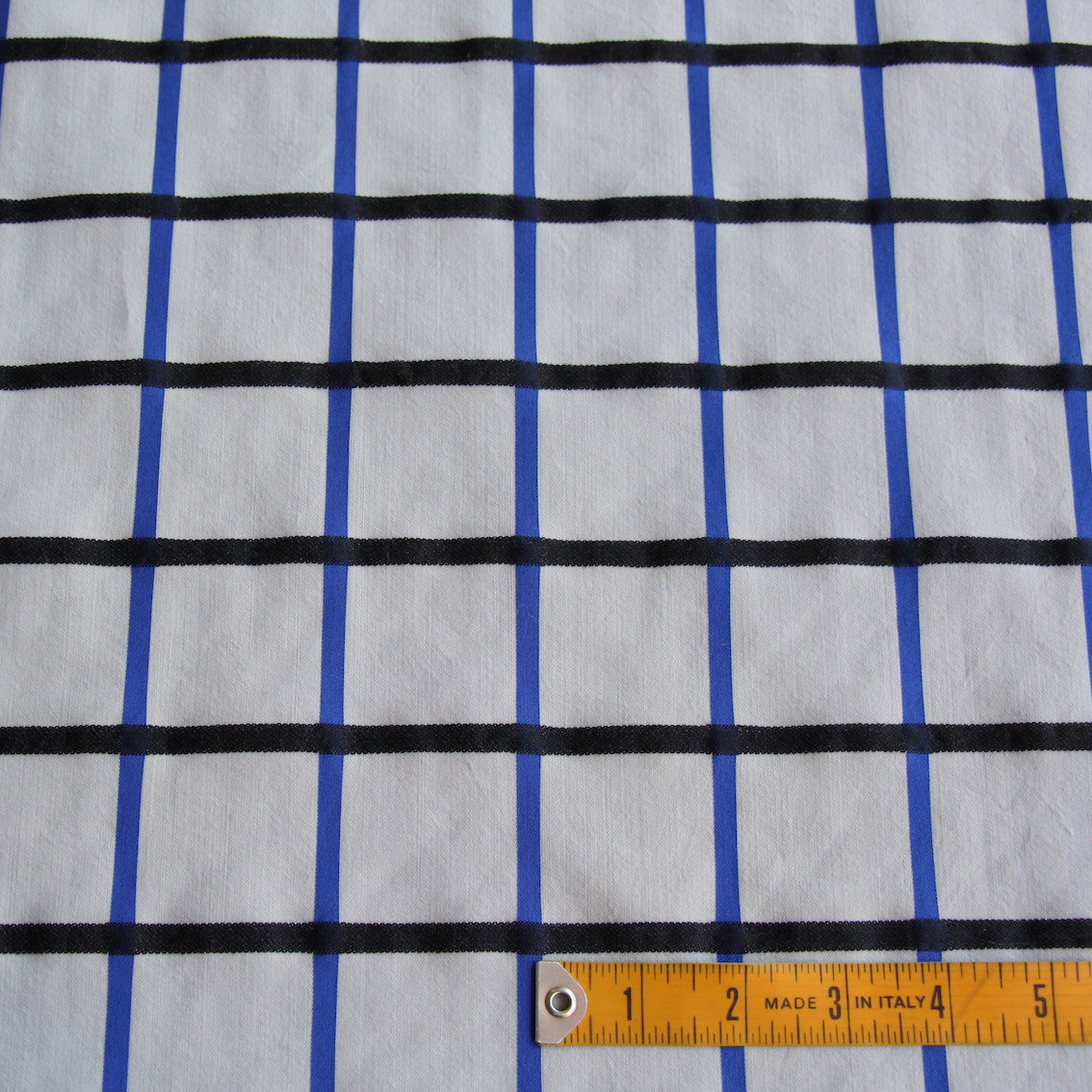 Italian designer black/blue check on chalk grey 65% wool 19% silk 16% cotton jacquard.