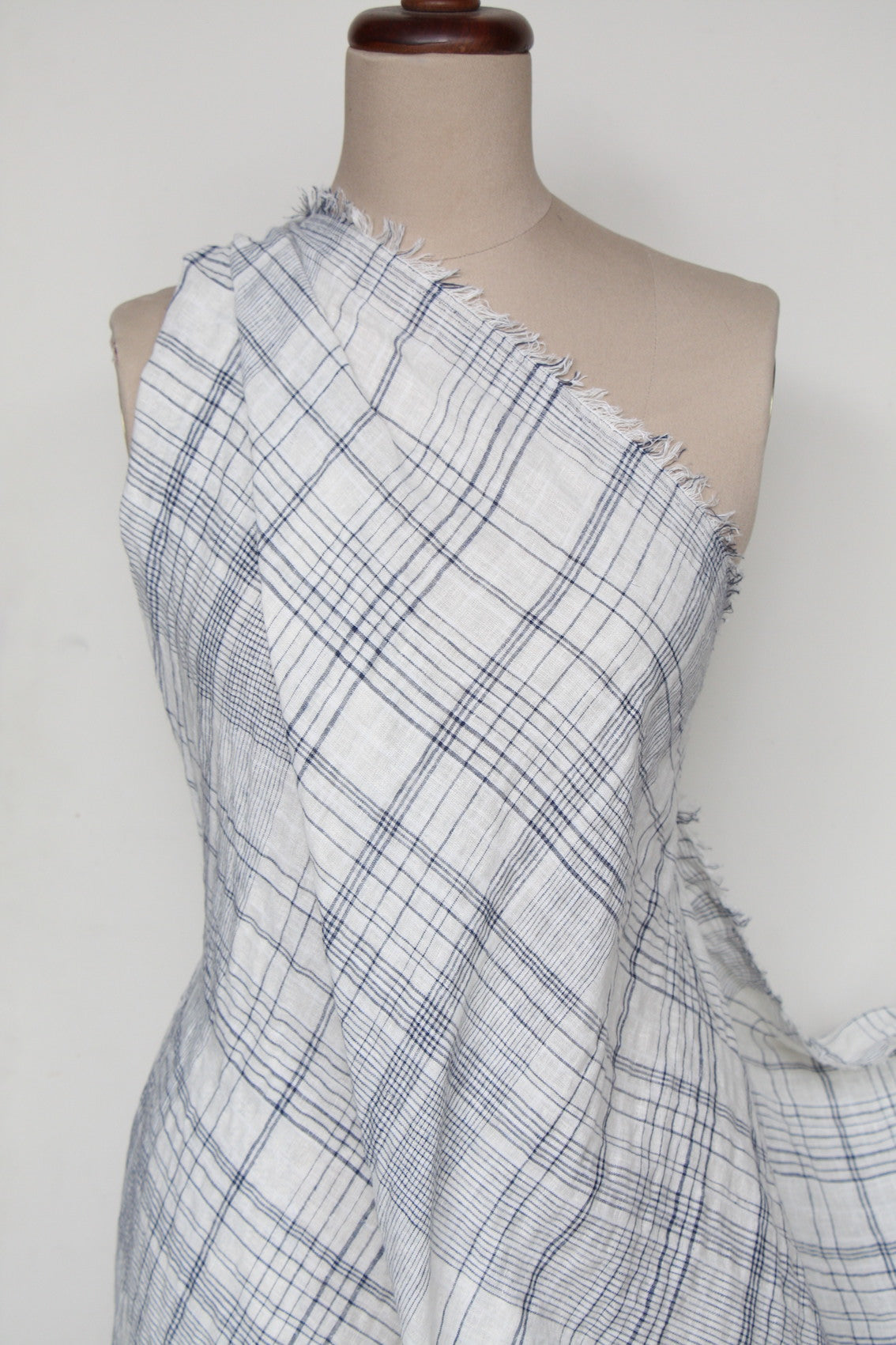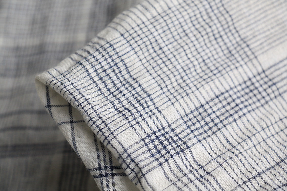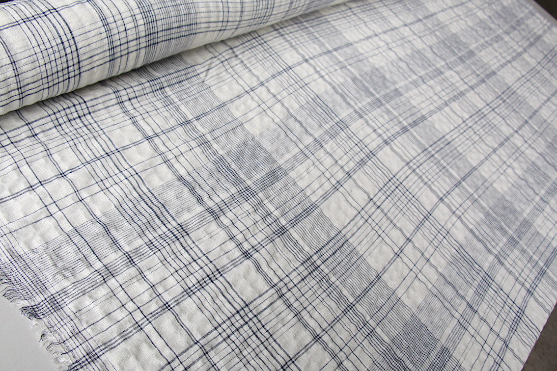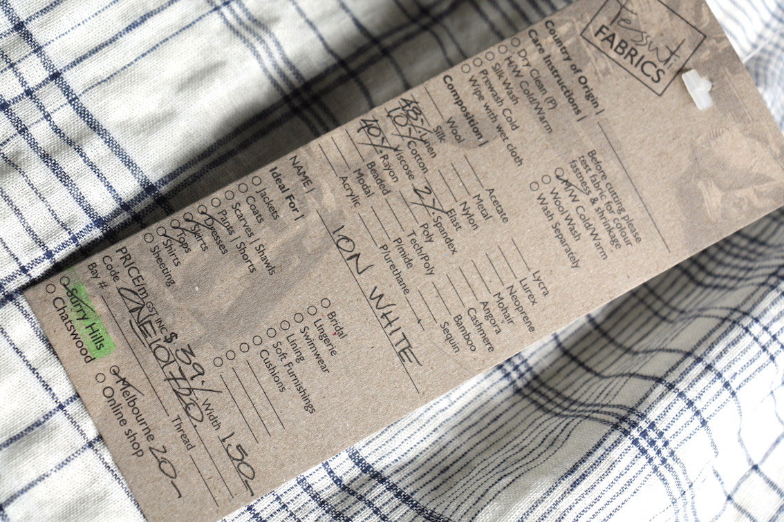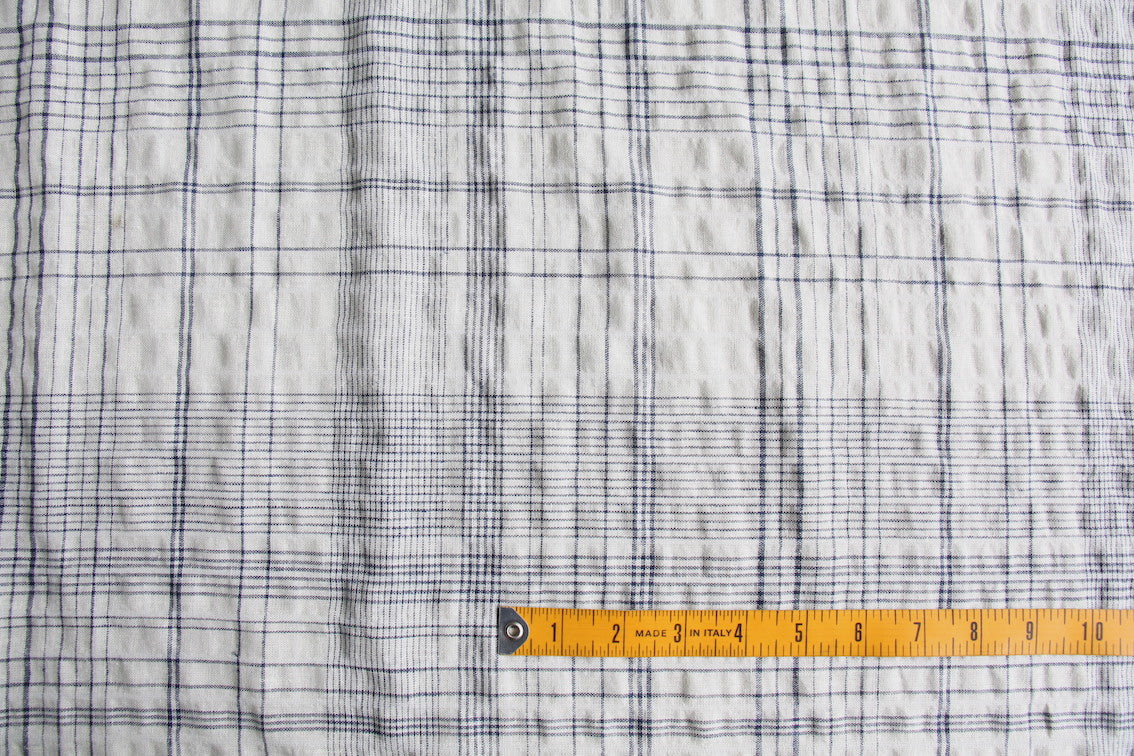 Washed cream/ivory/fine navy checked 48% linen 40% rayon 10% cotton 2% spandex. Width: 150cm