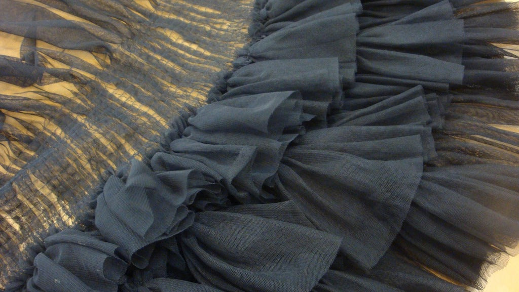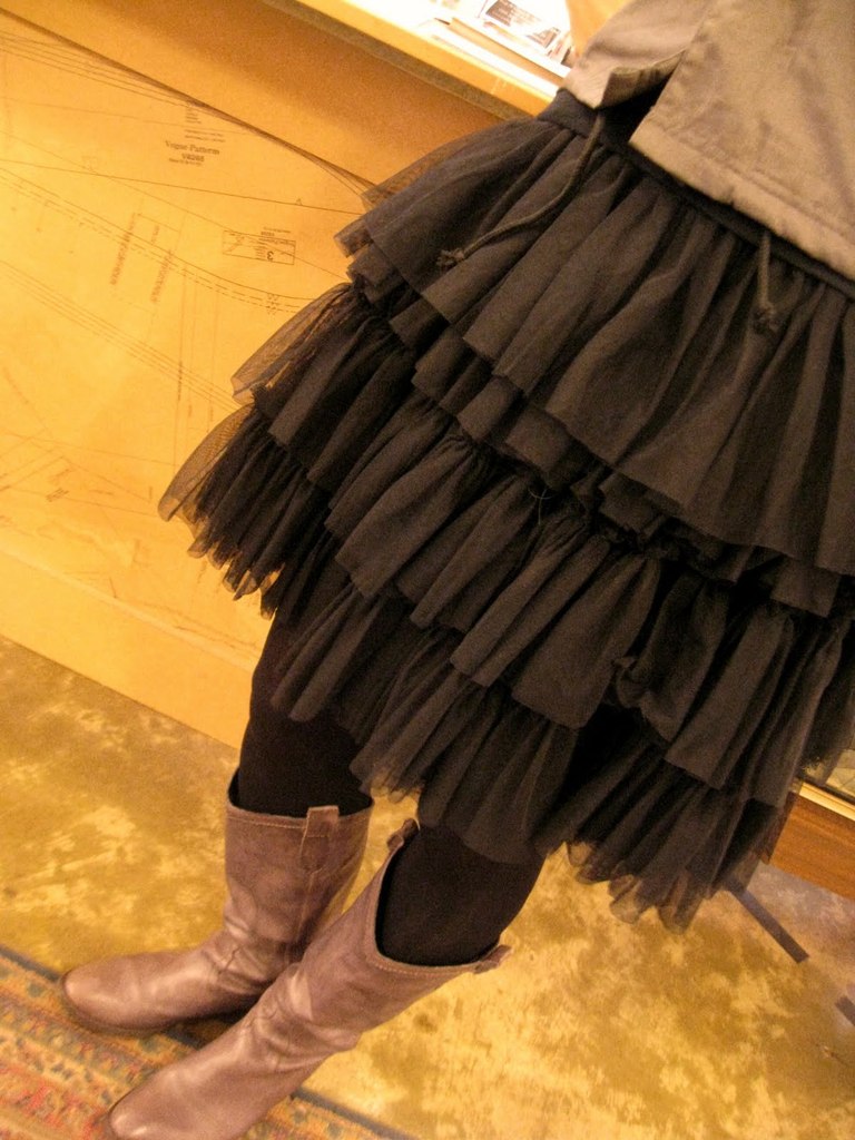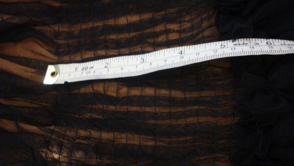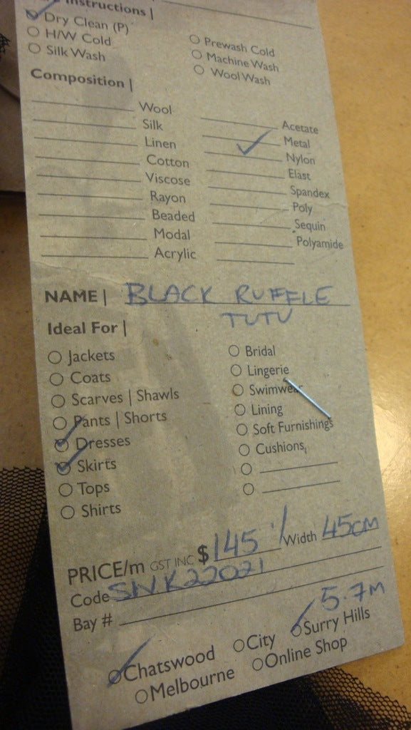 Black 100% Nylon Tulle with 3 layers of gathered frill and gathered/shirred top (approx 12.5cm wide and non stretch).