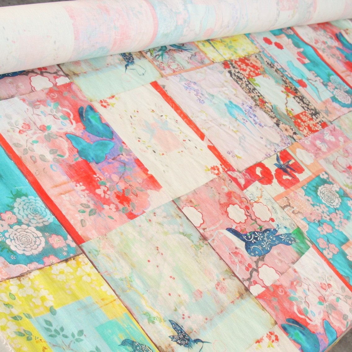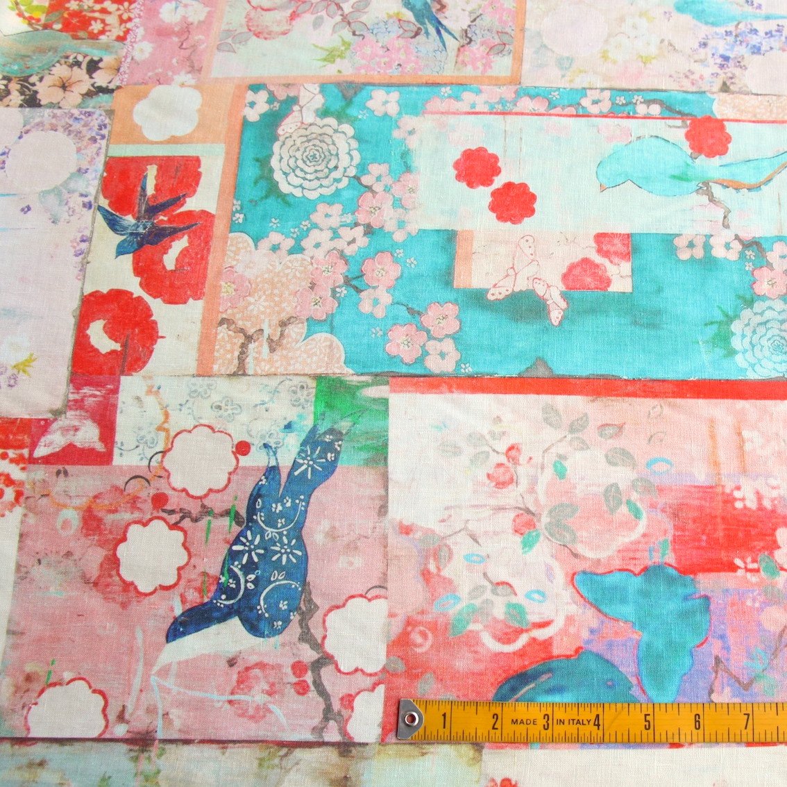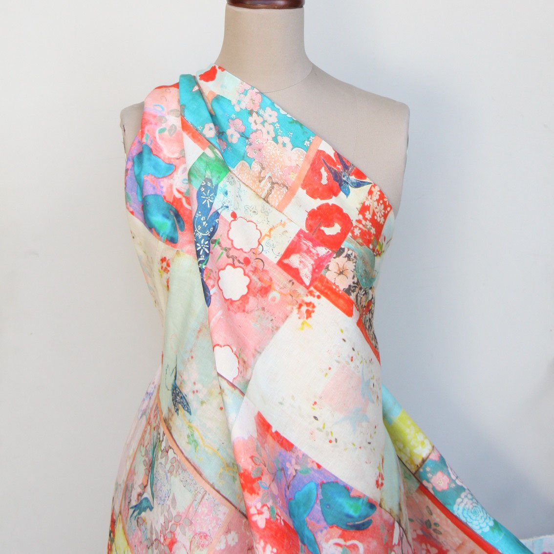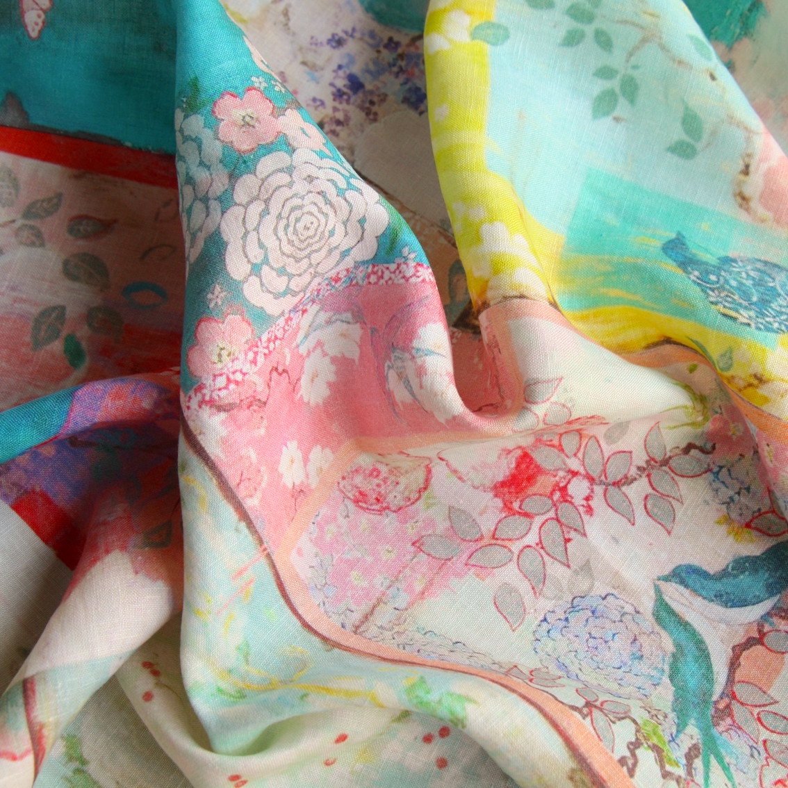 Aqua/coral flora digitally printed enzyme washed 100% linen