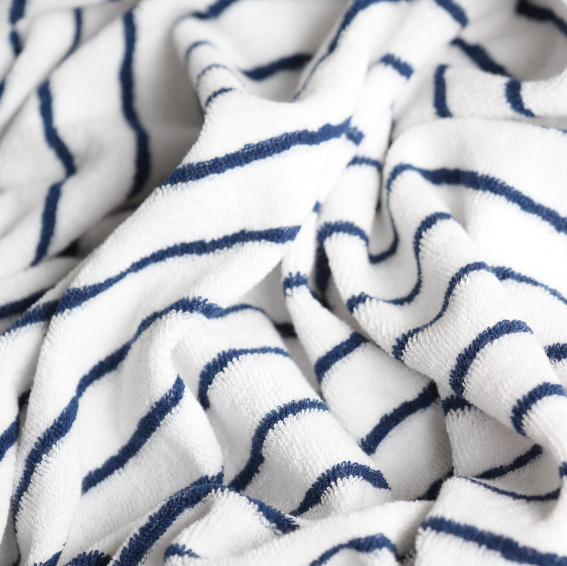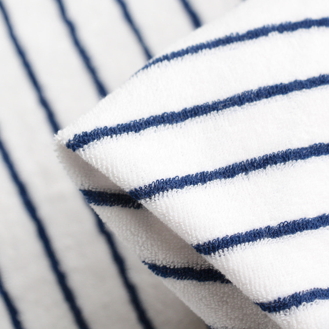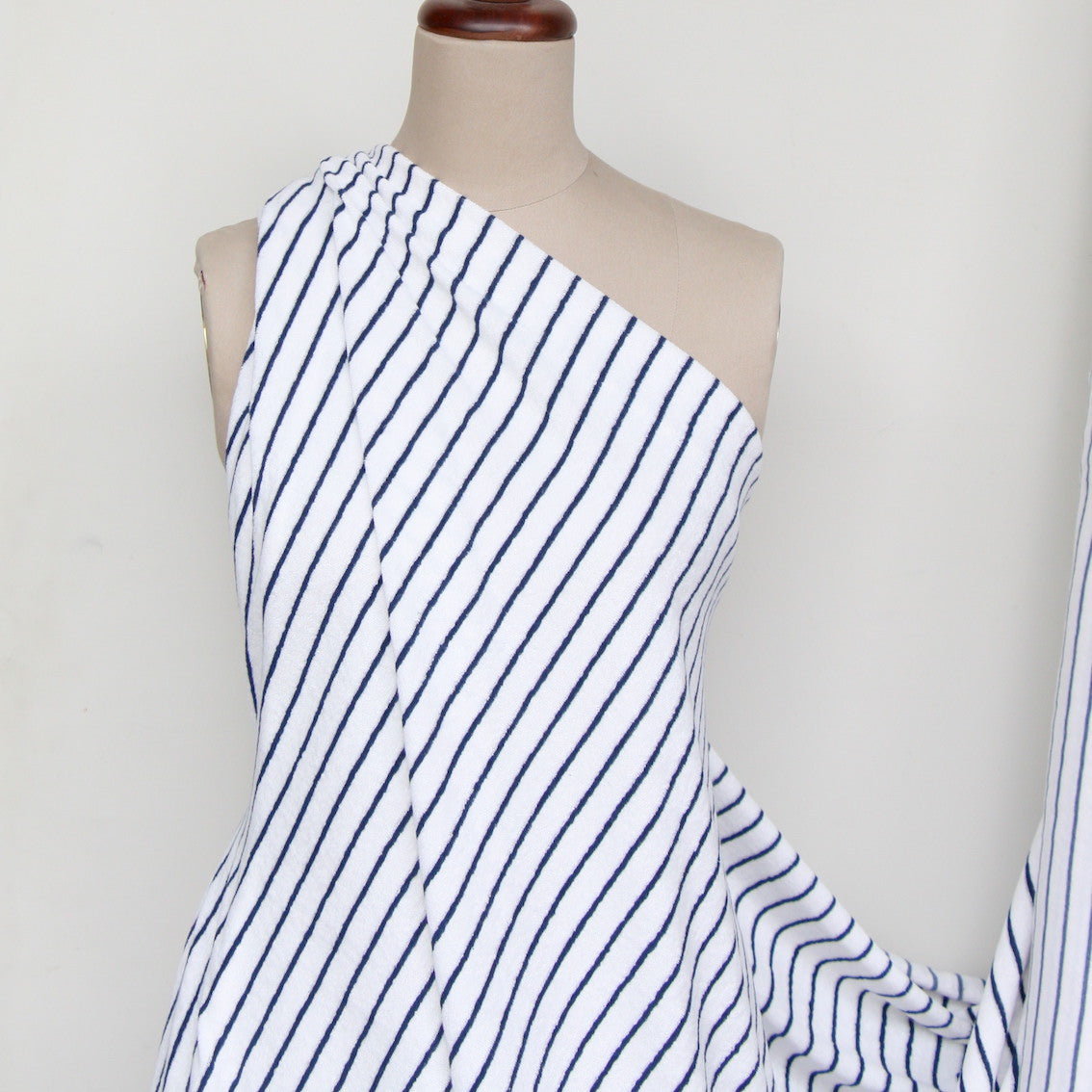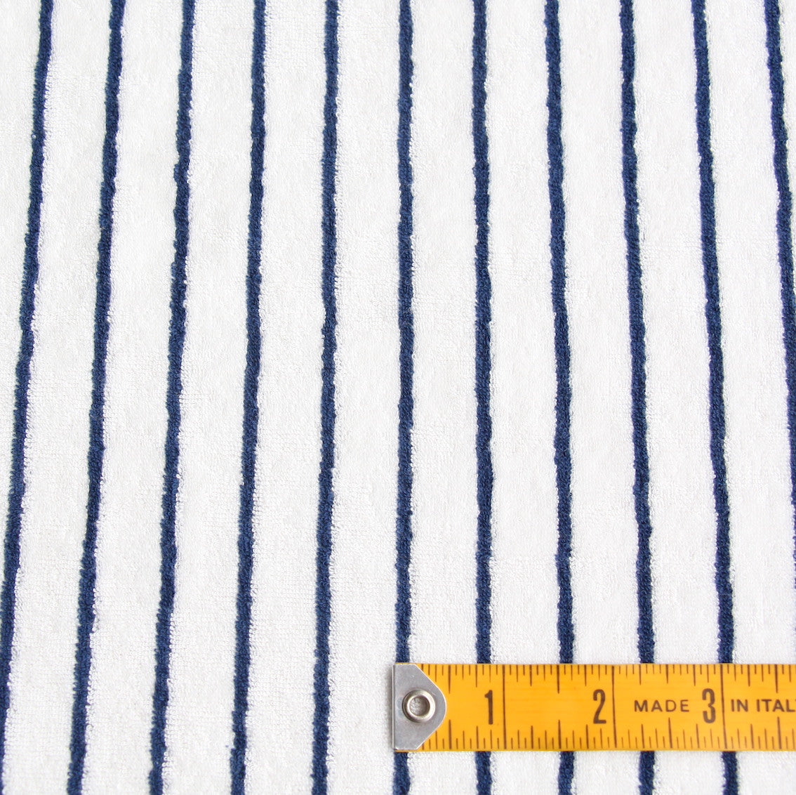 White/blue striped cotton/elastane loop French terry knit. Width: 185cm.